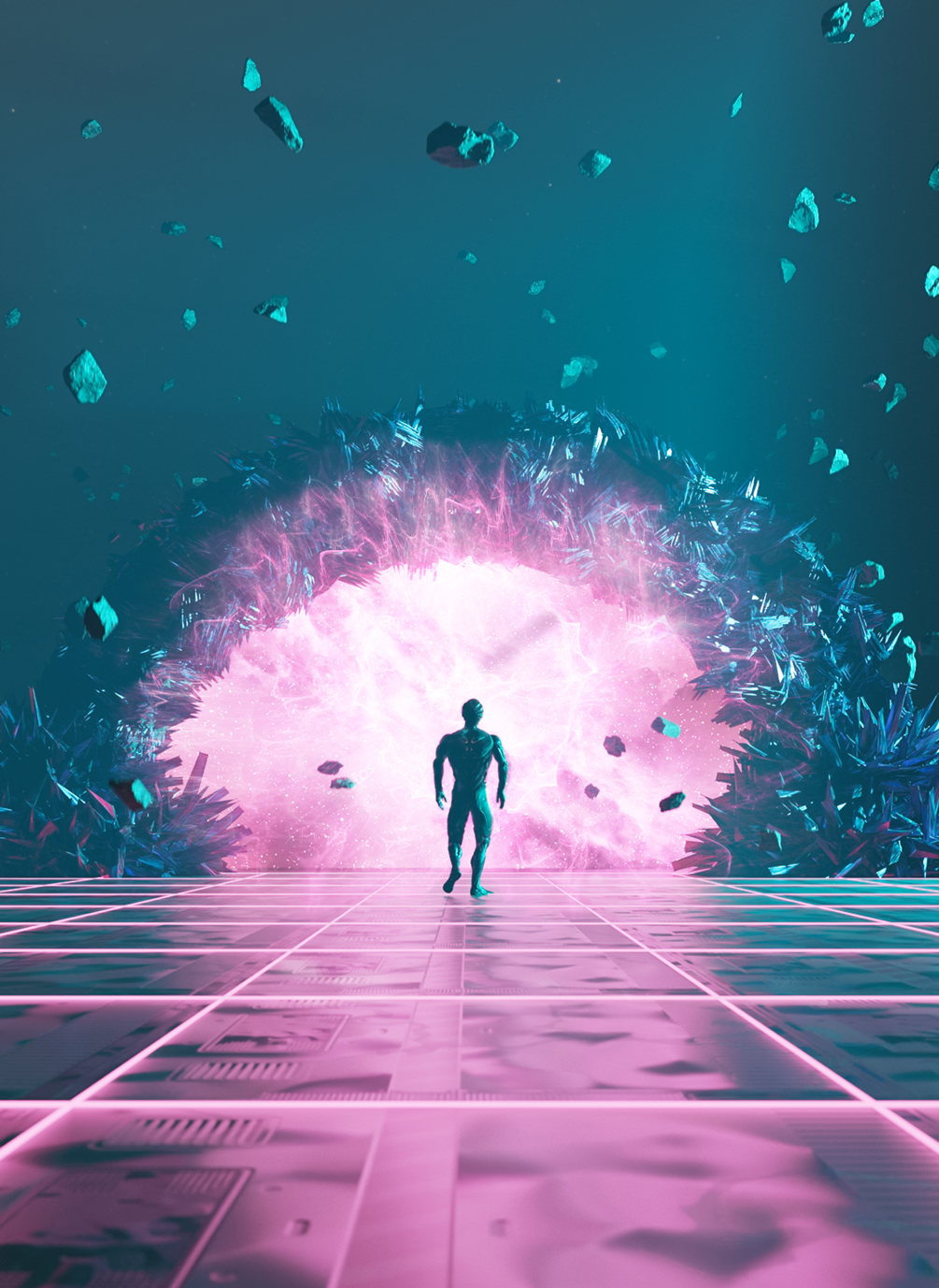 The artwork depicts a lone ranger floating in the vast expanse of space, with the stars and galaxies twinkling ahead of him as he finds an entrance to a unknown space